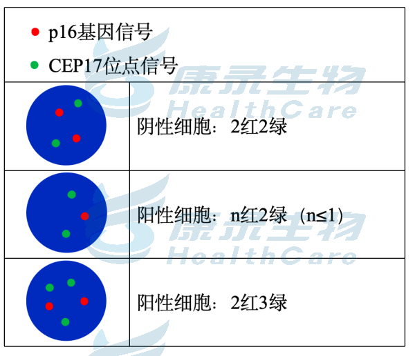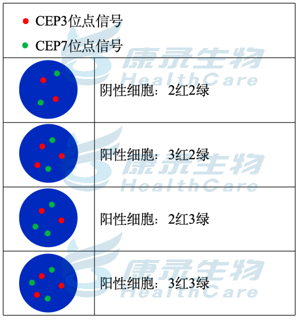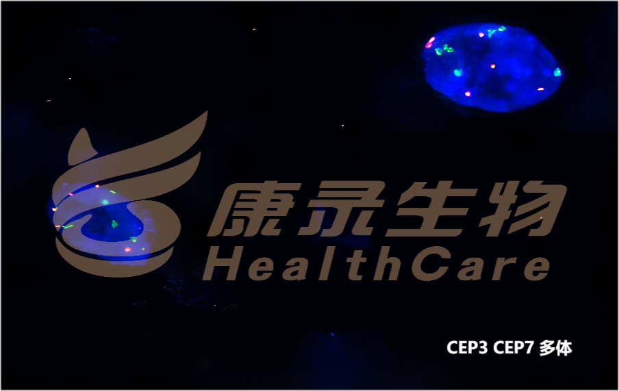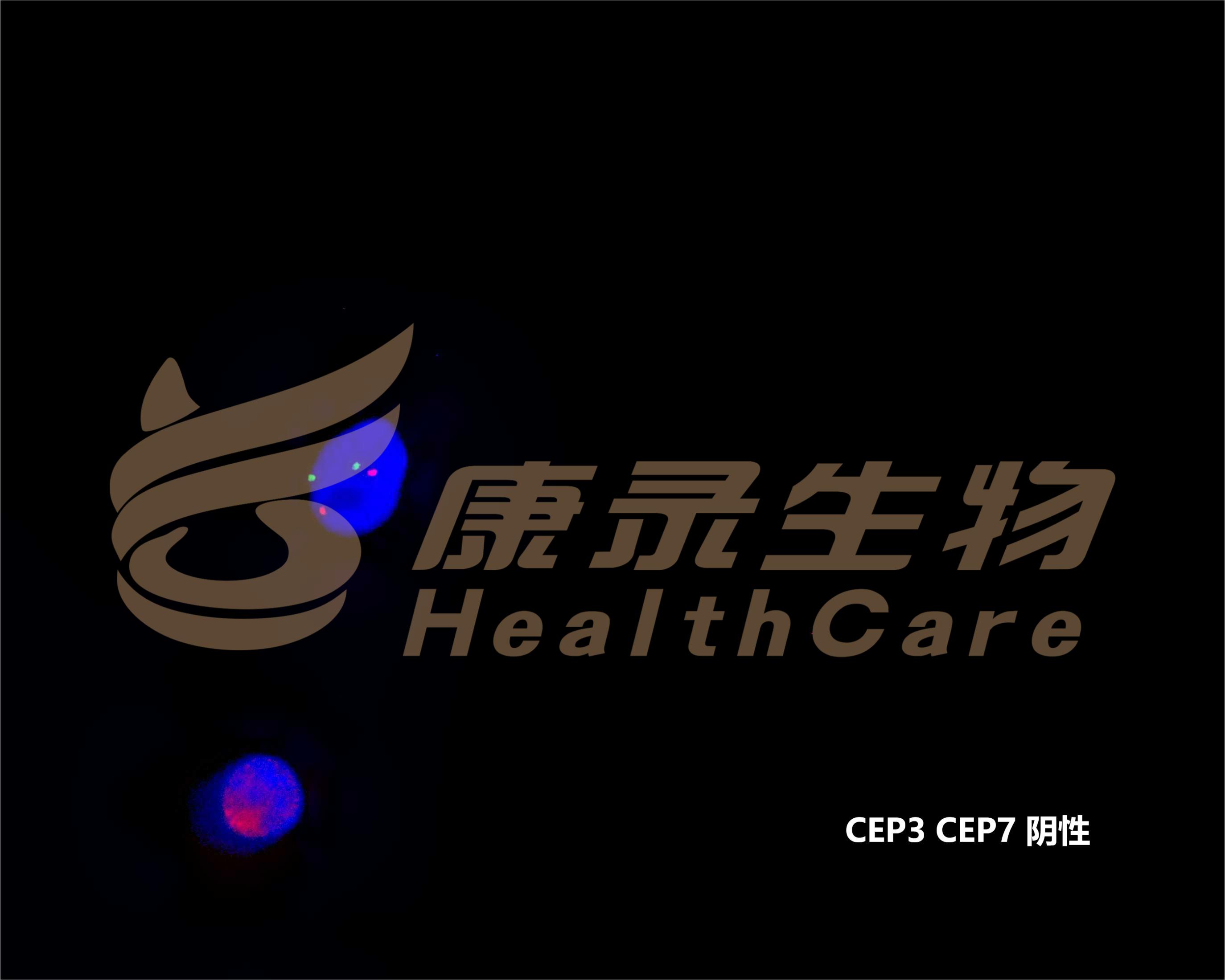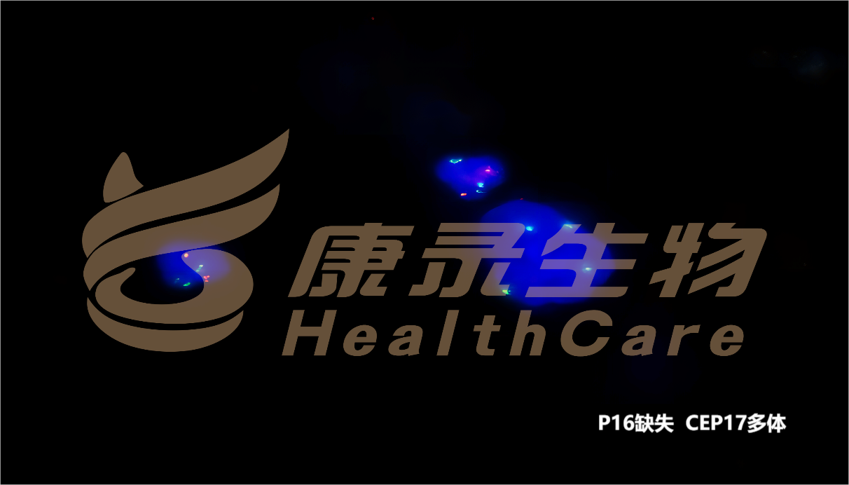 P16基因标记为橘红色; 17号染色体着丝粒(CEP17)标记为绿色。 3号染色体着丝粒(CEP3)标记为橘红色; 7号染色体着丝粒(CEP7)标记为绿色。