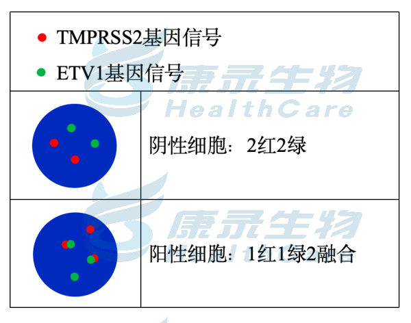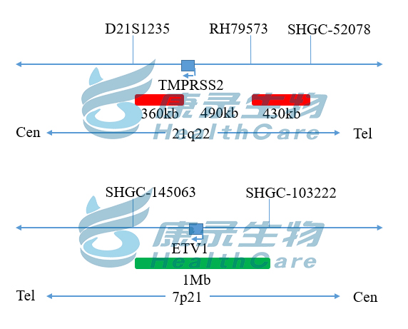 TMPRSS2基因(21q22)标记为橘红色; ETV1基因(7p21)标记为绿色。