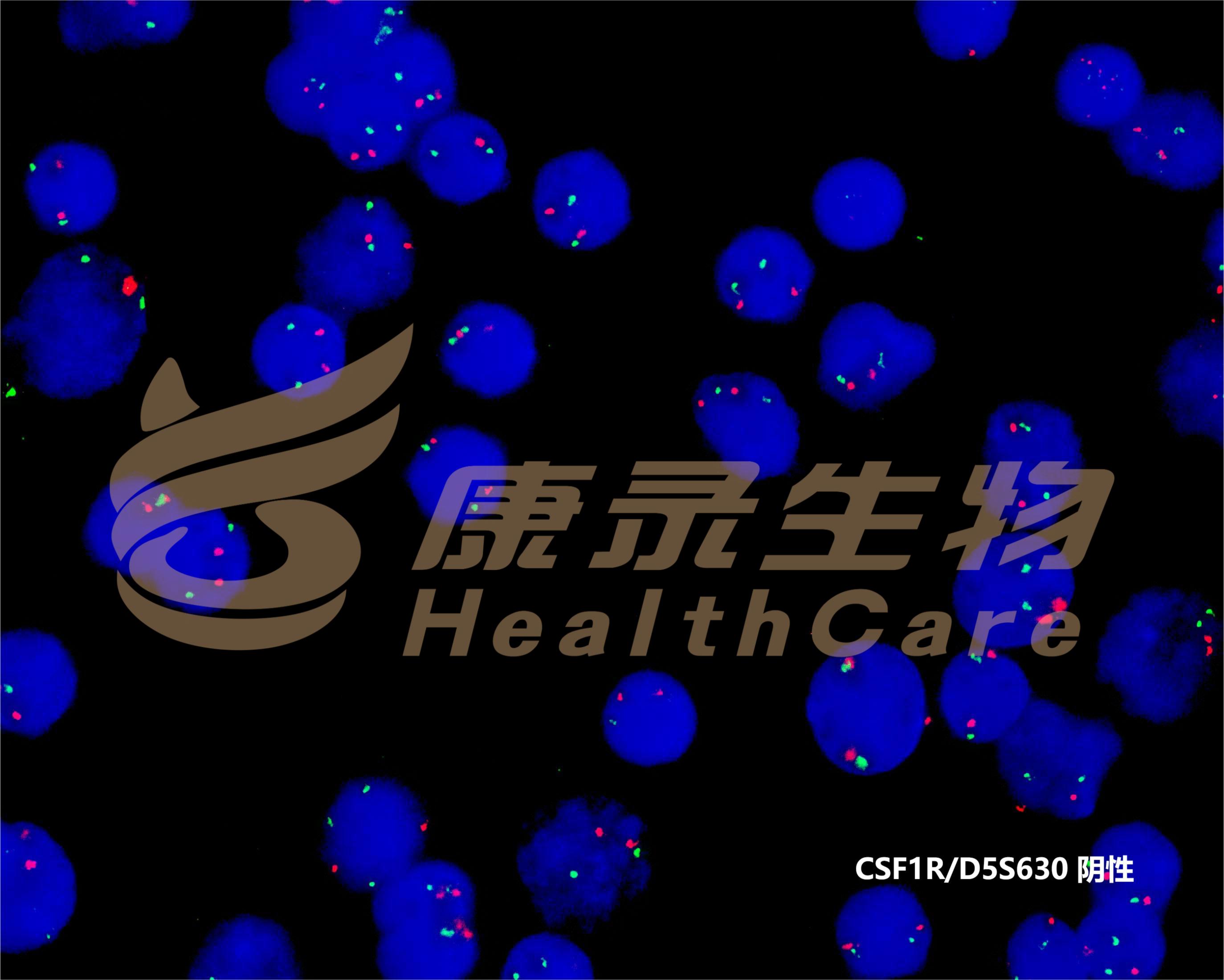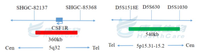 CSF1R基因(5q32)标记为橘红色; D5S630位点标记为绿色。