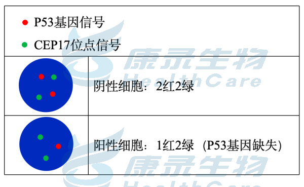 P53基因(17p13.1)标记为橘红色; 17号染色体着丝粒(CEP17)标记为绿色。
