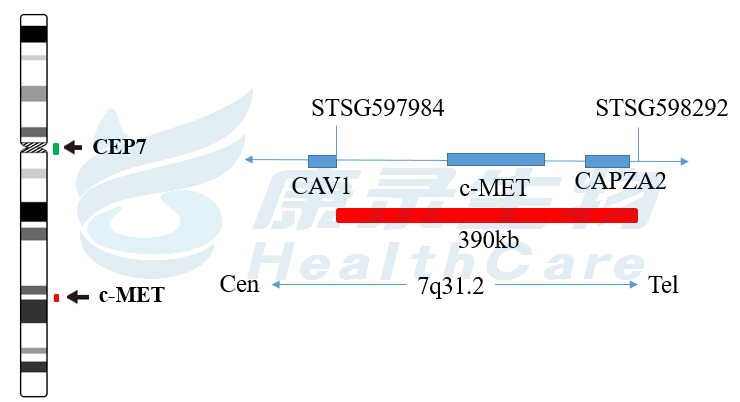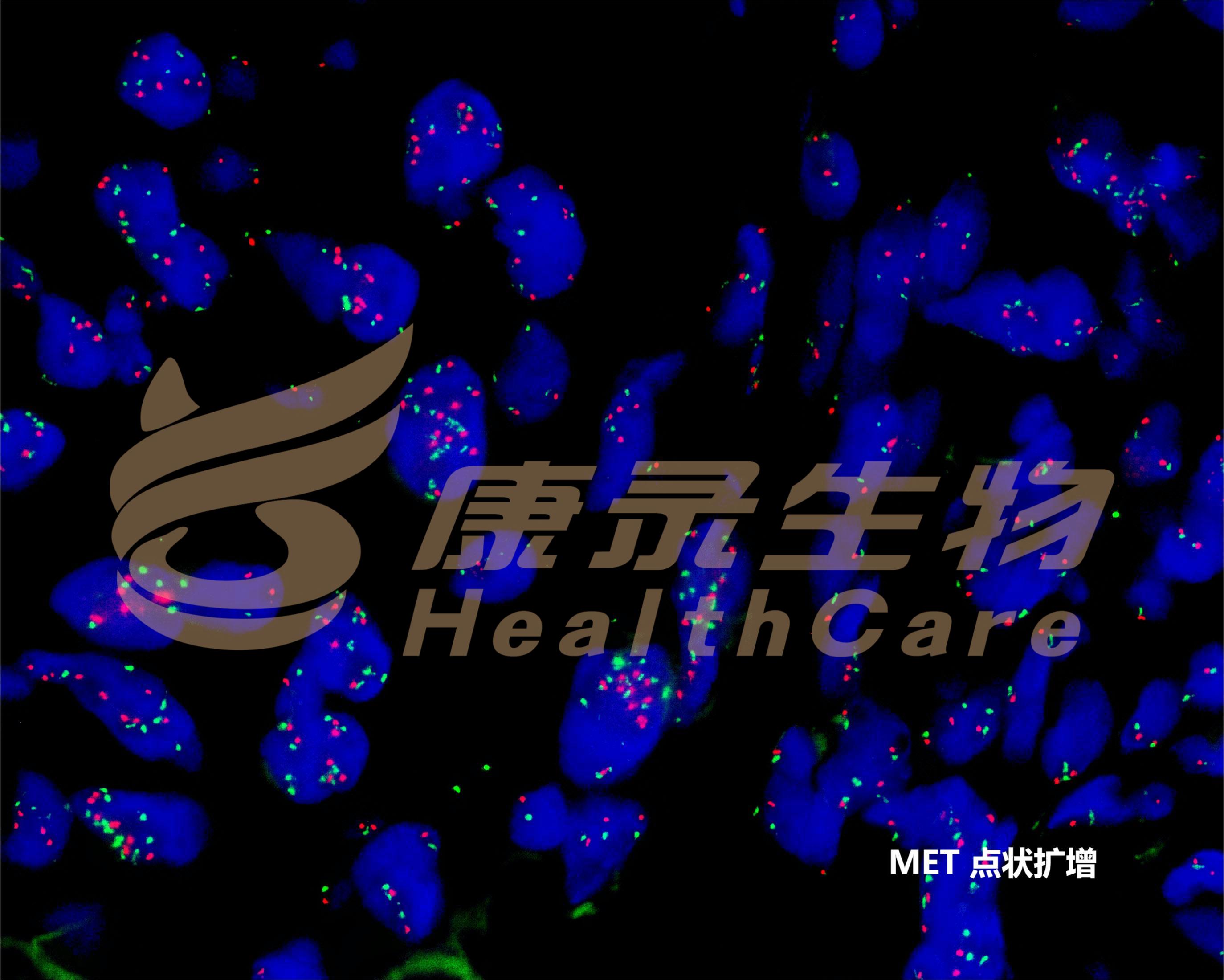 MET基因(7q31.2)标记为橘红色; 7号染色体着丝粒(CEP7)标记为绿色。