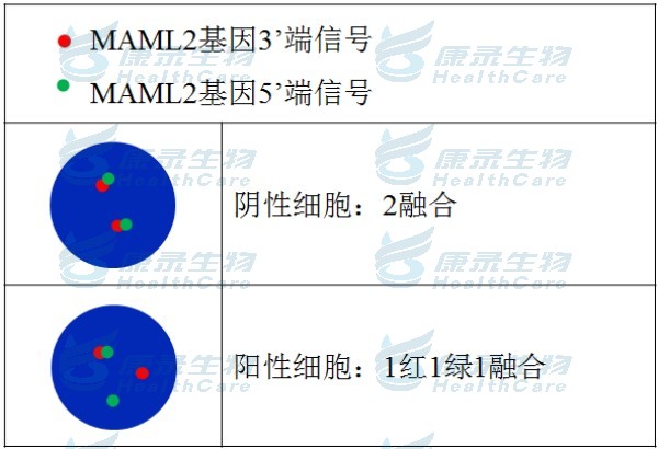 MAML2基因3’端标记为橘红色; MAML2基因5’端标记为绿色。