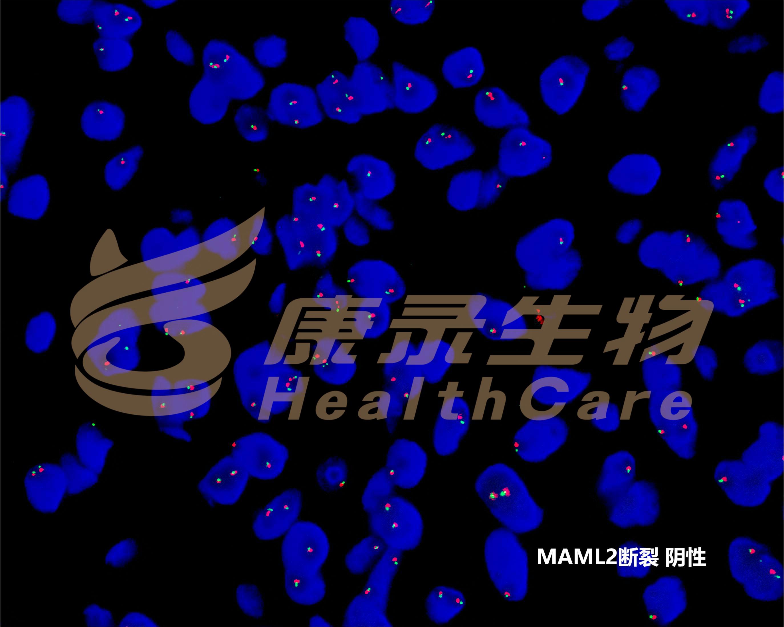 MAML2基因断裂可见于52~76%粘液表皮样癌。 粘液表皮样癌主要与Warthin瘤伴鳞状化生、 多形性腺瘤伴鳞状化生、皮脂腺或肿瘤伴鳞状化生、鳞状细胞癌、低分化腺癌等相鉴别。 约50%粘液表皮样癌有特征性的t(11;19)易位,导致形成MAML2-CRTC1 (MECT1)融合蛋白。 阴性易位的黏液表皮样癌被认为是腺鱗癌的一类独特亚型。 MAML2基因断裂探针可用于粘液表皮样癌的辅助诊断。