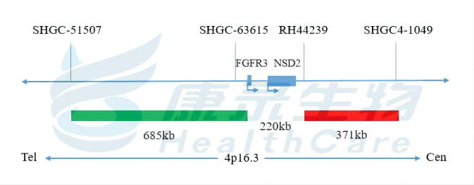 FGFR3基因3’端标记为橘红色; FGFR3基因5’端标记为绿色。