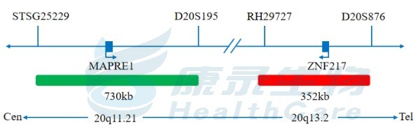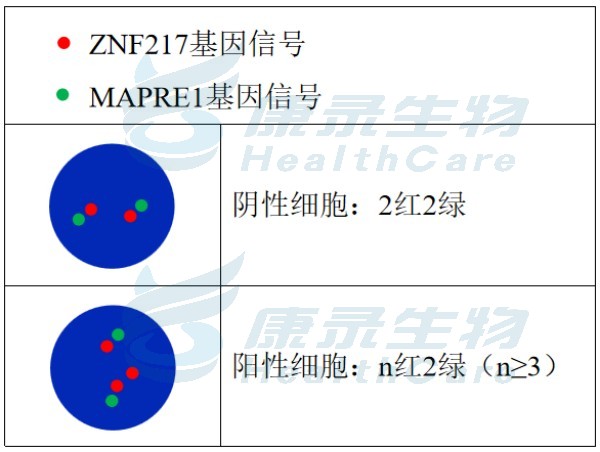 ZNF217橘红色探针;MAPRE1绿色探针。