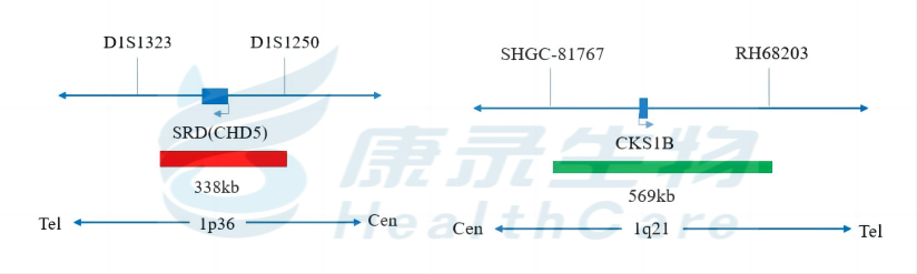 1p36(SRD)标记为橘红色; 1q21(CKS1B)标记为绿色。