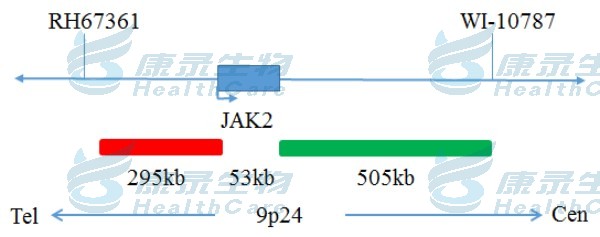 JAK2基因5’端标记为橘红色;JAK2基因3’端标记为绿色。