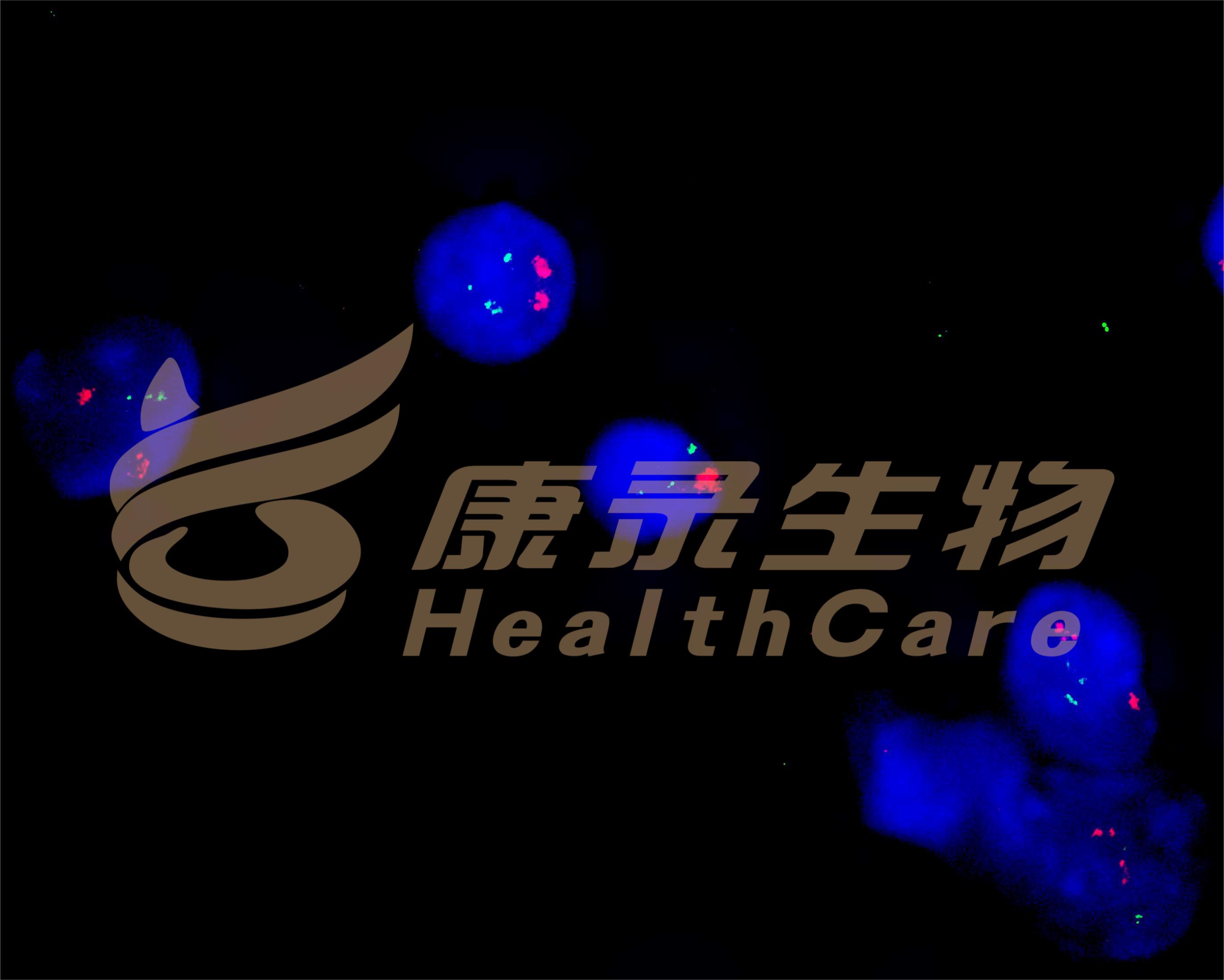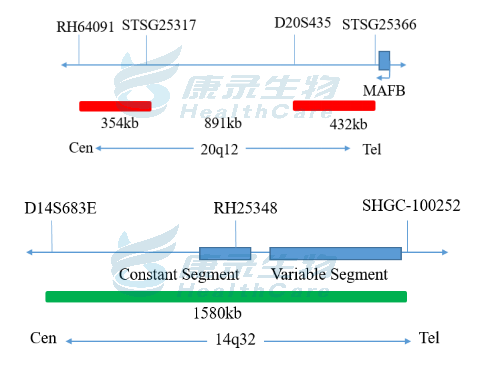 MAFB基因(20q12)标记为橘红色; IGH基因(14q32)标记为绿色。