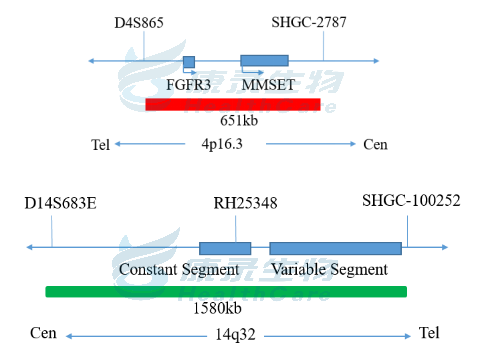 FGFR3基因(4p16.3)标记为橘红色; IGH基因(14q32)标记为绿色。