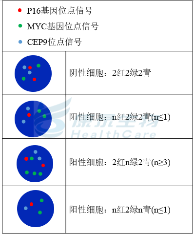 P16基因(9p21)标记为橘红色,长度为300kb; MYC基因(8q24)标记为绿色,长度为377kb; 9号染色体着丝粒(CEP9)标记为青色。