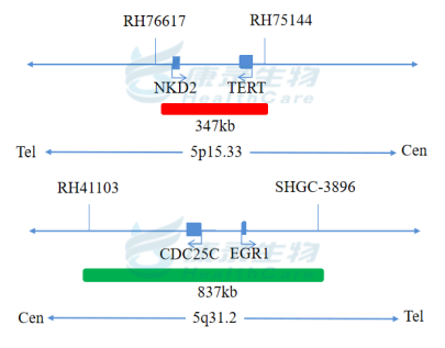TERT基因(5p15.33)标记为橘红色; EGR1基因(5q31.2)标记为绿色。