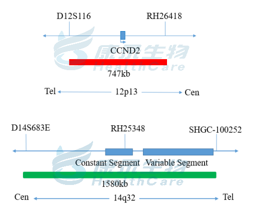 CCND2全长橘红色探针;IGH全长绿色探针。