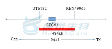 6q21(SEC63)橘红色探针;CEP6绿色探针。