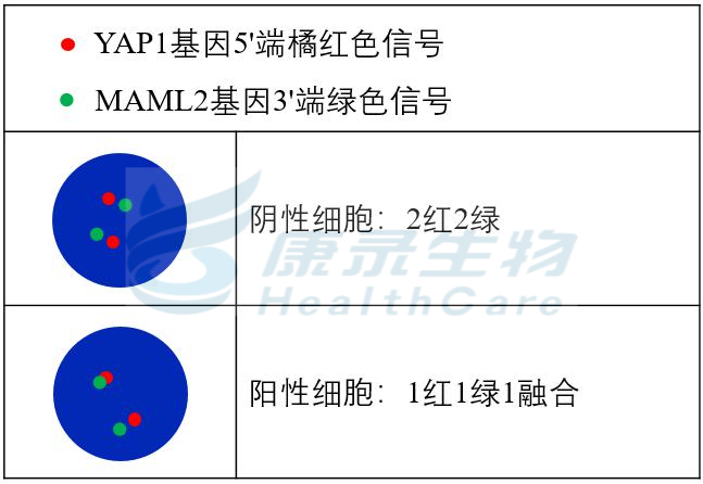 YAP1基因5'端橘红色探针;MAML2基因3'端绿色探针。