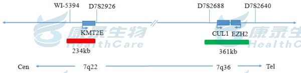 7号染色体缺失或7q缺失约发生于5-10%AML(M4及M6)及50%与治疗相关的AML/MDS。 -7/7q-的患者预后较差,可用于指导临床进行预后判断和治疗方案的选择,如可采用AML联合化疗和造血干细胞移植进行治疗。7q22再现性微缺失导致难治性贫血、单体7和AML,该区域包含不育α基序(SAM)结构9(SAMD9)和SAMD9L基因,对细胞增殖有负调控作用。