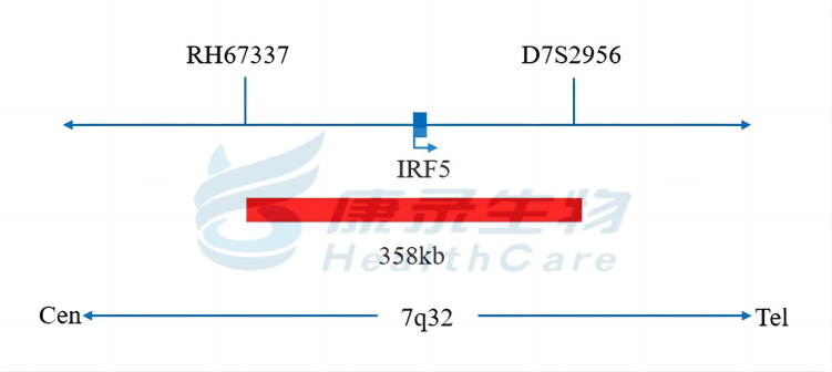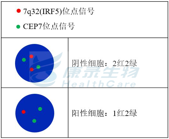 7q32(IRF5)橘红色探针;CEP7绿色探针。