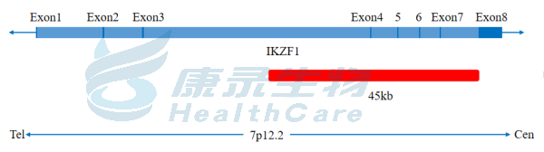 7p12(IKZF1)橘红色探针;CEP7绿色探针。