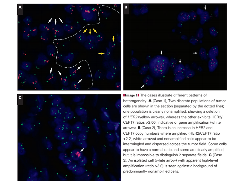 In this case (Image 1B), the amplified and nonamplified cells appear to be intermingled and dispersed across the tumor field. Some cells appear normal and some clearly amplified, but it is impossible to distinguish 2 separate fields.