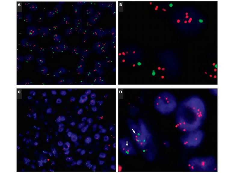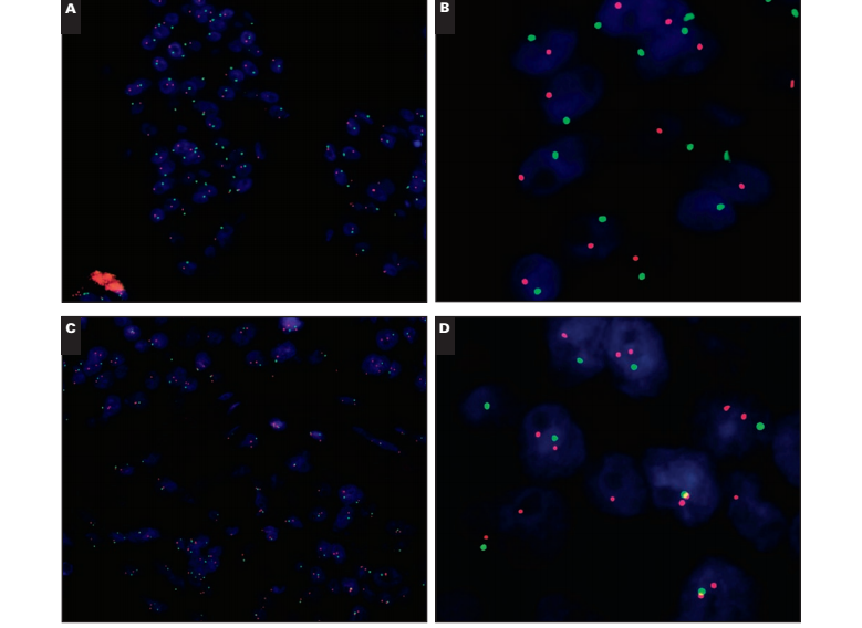 Other relatively common alterations that may affect the diagnosis of HER2 amplification include deletion of subchromosomal regions that may include the CEP17 and/or HER2 gene. Loss of both loci, through loss of the entire chromosome or microdeletions is intriguing but not overly challenging diagnostically. Likewise, loss of the HER2 region without loss of CEP17 will not pose a risk of misdiagnosis. Loss of the CEP17 region without loss of the HER2 gene locus could, in theory, lead to a false diagnosis of HER2 gene amplification. Discriminating between cases with monosomy of chromosome 17 and HER2 amplification on the residual chromosome and cases with loss of CEP17 but retention of HER2 is challenging and probably beyond the scope of conventional HER2 ISH technologies. This is particularly likely in cases in which no detectable CEP17 signals are observed despite the presence of multiple copies of HER2 in tumor cells and the presence of normal CEP17/HER2 signals in nontumor cells. Given the potential for misdiagnosis of HER2 amplification in the absence of CEP17 highlighted by our recent audit,10 this may represent a particular research priority. Further research into the cytogenetic karyotypes that underlie these cases is warranted to refine our understanding and potentially modify future diagnostic practice.