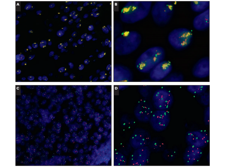 In this case (Image 1C), there are isolated cells with apparent high-level (ratio >3.0) amplification in the tumor against a background of predominantly nonamplified cells. Caution should be applied to ensure that the signal in apparently amplified cells is genuine and does not reflect a processing artifact. Some artifacts may appear to mimic true signals but fluoresce across multiple wavelengths (ie, autofluorescence). Therefore, a check that these signals do not appear under 4′,6-diamidino-2-phenylindole, green, or aqua filters should be performed before they are scored. If these signals are genuine, they should be counted.