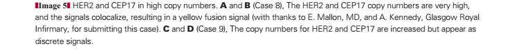 Although rare, coamplification of HER2/CEP17 is a topic of significant debate in the diagnostic community. Only 2 (0.1%) of 1,787 cases showed “colocalization” of the HER2 and CEP17 signals in the current audit Image 4. Colocalization of CEP17 and HER2 is observed when the HER2 (red; Image 4B) and CEP17 (green; Image 4C) FISH signals overlap to produce a yellow “merged” signal (Image 4A). This is a rare occurrence, thought to reflect coamplification of the CEP17/HER2 signals. However, a larger number of cases, 22 (1.2%), showed high copy numbers of HER2 (≥6 copies per cell) with duplication of CEP17 signals such that the overall HER2/CEP17 ratio did not exceed 2.0. The interpretation of these cases remains difficult with little evidence to support diagnosis; at present, we have interpreted balanced duplication of HER2/CEP17 (≥6 signals for HER2/CEP17 with ratios near 1) as evidence of coamplification.