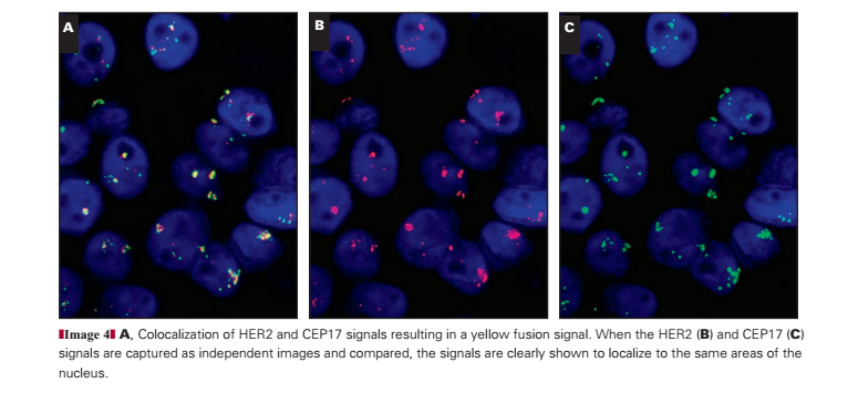 We identified only a very small number of cases (0.1%) with apparent coamplification of the CEP17 and HER2 signals, although a larger number exhibited high HER2 and CEP17 copy numbers, which raises suspicions regarding these cases. Despite the small number of cases in this category (about 1% of cases with equivocal immunohistochemical results), they generate, rightly, a significant amount of discussion in the field. The true biologic definition and consequences of coamplification in the context of HER2 and CEP17 is unclear, and this makes the basis for reporting guidelines for these cases, at present, a matter of expert opinion. Clearly, there is a need for rapid progress in research in this area. The HER2 amplicon is complex and can extend to the telomere and centromere; it also may involve a series of complex amplifications and deletions11 It is thus possible that the amplicon could extend into the pericentromeric region where the CEP17 probe binds. In this situation, the HER2 and CEP17 probes seem to colocalize, resulting in a yellow signal. Visualization on single bandpass filters confirms the localization of the HER2 and CEP17 signal to the same position. This colocalized signal pattern is rare, being observed in fewer than 1% of cases.