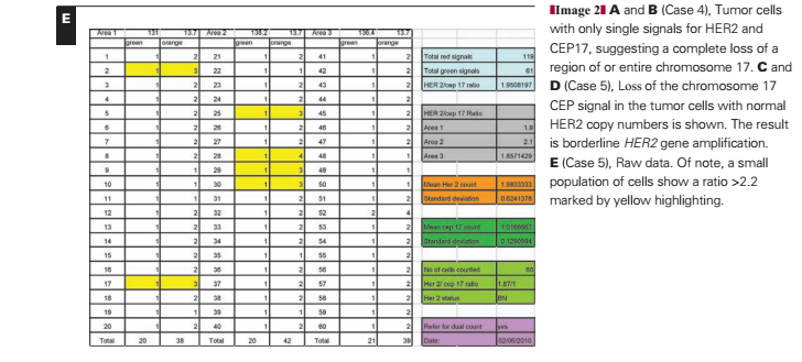 In this case Image 2C and Image 2D, there is a loss of the chromosome 17 CEP signal in the tumor cells (again with normal cells adjacent displaying a normal signal pattern). The loss or deletion is observed only for the CEP17 signal, with normal HER2 copy numbers. The result is borderline HER2 gene amplification with a mean HER2 copy number of 1.98 (SD, 0.62) and a mean CEP17 copy number of 1.02 (SD, 0.13); the HER2/CEP17 ratio is 1.95. Under UK guidelines, with 60 counted cells, this case would be regarded as “borderline but nonamplified” and under American Society of Clinical Oncology/College of American Pathologists3 guidelines as equivocal. The presence of 6 (10%) of 60 cells with an individual HER2/CEP17 ratio of 2.20 or more would mean that under current College of American Pathologists guidelines,8 this case would be regarded as exhibiting heterogeneous HER2 gene amplification despite a mean HER2 copy number of fewer than 2 copies per cell Image 2E. However, a recent audit by our group suggests that the presence of up to 30% of cells with HER2/CEP17 ratios 2.20 or more have no impact on outcome.6