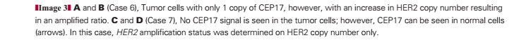Interpretation.—This is a nonamplified tumor by HER2 ratio (HER2/CEP17). It is not clear whether there is a loss of an entire chromosome 17, as suggested for case 4, with a low-level duplication of HER2 or whether there is a specific loss of the pericentromeric region containing the CEP17 α-satellite in one chromosome. This is likely to be the result of a chromosome rearrangement and imbalance. Other possibilities (also seen in other solid tumors by cytogenetics) include the loss of one chromosome 17 with the formation of an isochromosome for the long arm of chromosome 17 and an unbalanced translocation with retention of the derivative chromosome containing 17q material and the HER2 locus. The presence of a small proportion (<30%) of low-level “amplified” cells is not regarded as significant and should not be reported. It has been suggested that cases exhibiting monosomy 17 are poor responders to trastuzumab,9 although this evidence is not conclusive.