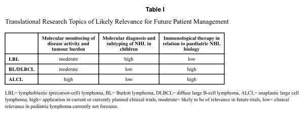In summary, despite high survival rates reached by intensive poly-chemotherapy for children with NHL, cure for all, or at least most, children with acceptable side effects and late morbidity needs collaborative efforts of preclinical and clinical researchers. Innovative and argeted treatment options are becoming increasingly available to children and adolescents who are diagnosed with NHL. Numerous approaches combining or substituting current hemotherapy with targeted drugs and immunotherapeutic approaches need to be developed and tested clinically against NHL in children during the next decades. By influencing and translating advances in molecular characteristics of tumour presentation, therapy strategies can be developed upfront and for recurrent disease. Additional impact on improving outcome can be achieved through monitoring for MDD/MRD through unified efforts internationally. Some elements of translational research discussed in this article and at the 5th International Symposium on Childhood, Adolescent and Young Adult Non-Hodgkin Lymphoma on October 22 nd to 24 th 2015 in Varese, Italy are already very close to influencing patient management (Table I). These advances in paediatric lymphoma have been accomplished by the concerted efforts of paediatric NHL cooperative groups globally, which could be a paradigm to achieve successes in other diseases as the prognosis for childhood cancer continues to improve.