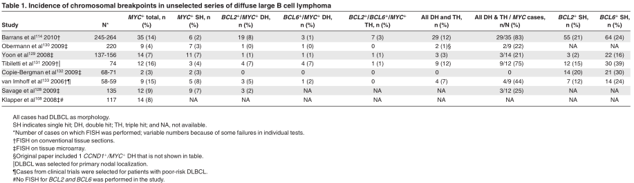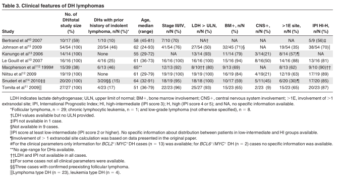 In this section we focus on DH lymphomas involving MYC, BCL2, and BCL6. We collected clinical features of DH cases from 8 studies with ? 10 DH cases and with sufficient clinical data (Table 3). 10-15,40,112 Median age for the DH lymphomas ranged from 51 to 65 years. DH lymphomas are extremely rare in children younger than 18 years of age. 113