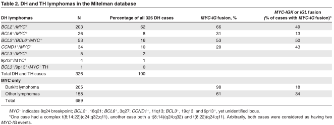 DH and TH lymphomas are B-cell lymphomas characterized by a recurrent chromosomal translocation in combination with a MYC/ 8q24 breakpoint, the latter mostly as a secondary event involved in transformation. The compiled cytogenetic and FISH data strongly suggest that many lymphomas other than BL with a MYC breakpoint represent DH lymphomas. This implies that the studies that only focused on the effect of MYC breakpoints in DLBCL have to be reconsidered. Most DHs have a BCL2 + /MYC + combination, and most BCL6 + /MYC + DH lymphomas represent BCL2 + /BCL6 + / MYC + TH lymphomas. CCND1 + /MYC + DH lymphomas may be more frequent than anticipated and should receive more attention.