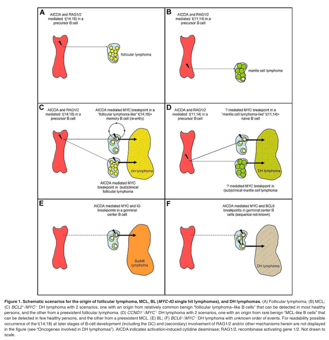 The gene encoding cyclin D1 (CCND1) is located on 11q13 and is involved in cell cycle progression from the G 1 to the S phase, by forming a complex with CDK4 and activating the RB1-E2F1 complex, allowing E2F1 to be released. Although CCND2 and CCND3 are expressed in normal B cells, CCND1 is not. In consequence, CCND1 is almost exclusively expressed in neoplastic B cells with genetic alterations of 11q13, that is, translocation or copy number increase. In most MCLs and in a substantial fraction of multiple myelomas 11q13 translocations are observed. 77-80 In addition to these malignancies, also hairy cell leukemia and some cells in the proliferation centers of chronic lymphocytic leukemia as well as extremely rare DLBCL cases may express CCND1, the mechanism being unknown. 81 Like the t(14;18), the t(11;14) in MCL is mediated by RAG1/2, probably in combination with low levels of AICDA as well as other mechanisms. 50,82 Similar to the t(14;18), also CCND1 breakpoints are strongly centered at CpG islands, indicating a concerted action of AICDA and RAG1/2 in precursor B cells. 50 As seen for the t(14;18), also occasional t(11;14) ? cells can be found in the blood of healthy persons, however at much lower frequencies than t(14;18) ? cells. 83 This low frequency may be because these cells are not expanded in the GC cell reaction. This fits with the finding that MCL represents a pre-GC B-cell lymphoma. Of note, the t(11;14) in myeloma has a different configuration of the breakpoint with strong indications of an AICDA-mediated breakpoint initiated in GC B cells. 84