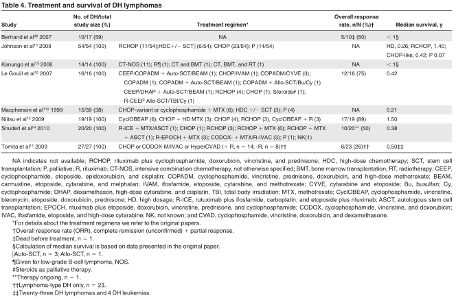 In Table 4, a summary is given for the most relevant published clinical studies in which patients with DH lymphoma could be identified. Patients were treated with a variety of regimens (includ- ing doxorubicin-based chemotherapy regimens as well as highdose chemotherapy regimens with stem cell transplantation). In some instances only palliative therapy was given. With these limitations taken into account, DH lymphomas generally tended to have a poor survival, with a median overall survival of only 0.2-1.5 years. 10-15,40,112