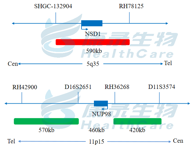 NSD1全长橘红色探针;NUP98全长绿色探针