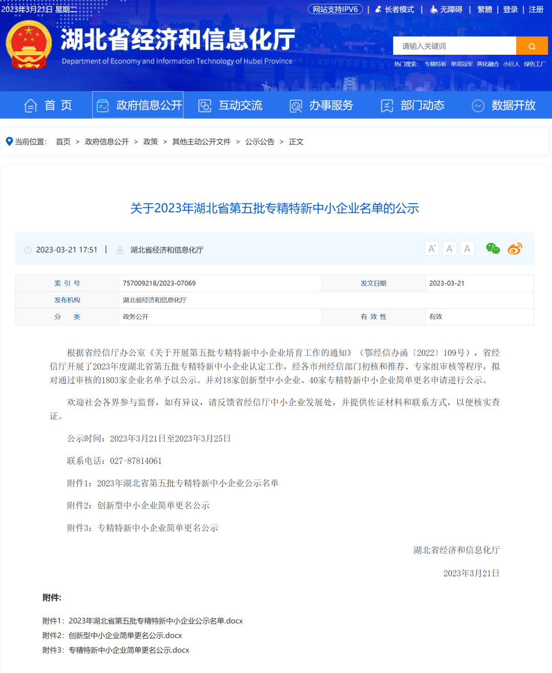 根据省经信厅办公室《关于开展第五批专精特新中小企业培育工作的通知》(鄂经信办函〔2022〕109号),省经信厅开展了2023年度湖北省第五批专精特新中小企业认定工作,经各市州经信部门初核和推荐、专家组审核等程序,拟对通过审核的1803家企业名单予以公示。并对18家创新型中小企业、40家专精特新中小企业简单更名申请进行公示。
